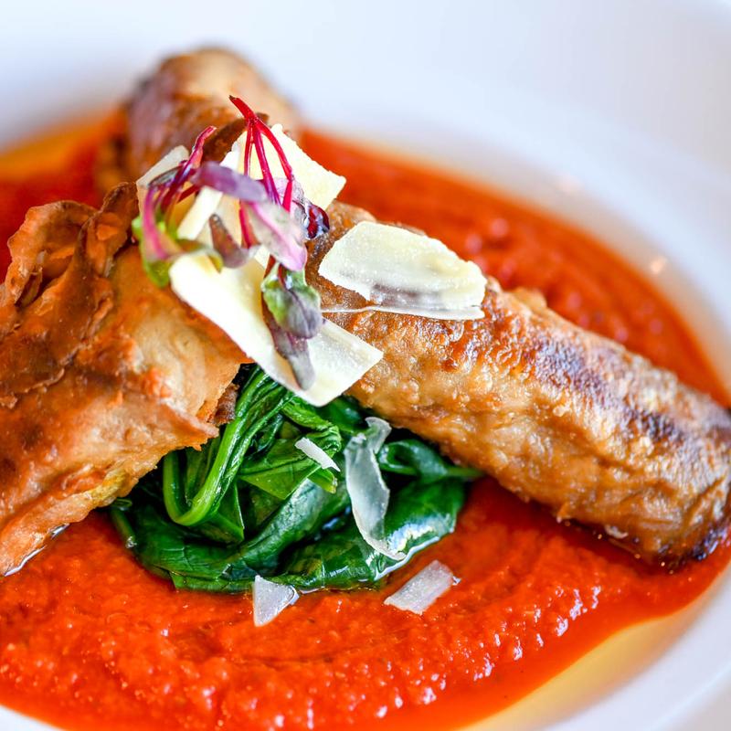 Eggplant, boursin cheese, roasted red pepper, spinach, plum tomato sauce.